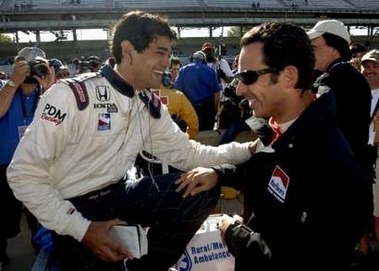 laugh together after Castroneves congratulated Medeiros for qualifying for the