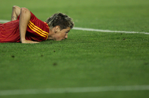 Spain's Fernando Torres reacts after missing a chance to score during a friendly soccer match against Russia at Carlos Belmonte stadium in Albacete May 27, 2006.[Reuters]