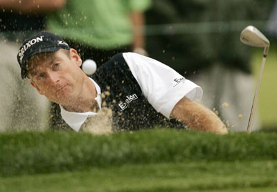 U.S. golfer Jim Furyk hits out of a sand trap on the third hole