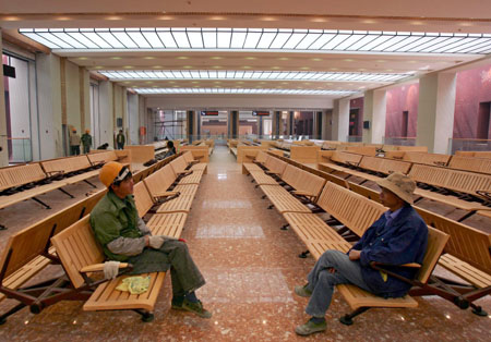 Workers rest at the nearly finished Lhasa Railway Station in Lhasa, Tibet, June 24, 2006. The Qinghai-Tibet Railway, which will begin trial operations on July 1, 2006. [Reuters]
