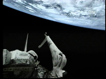 payload bay of the orbiter in this view from a video camera mounted on the