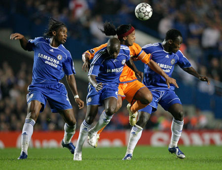 (L-R) Didier Drogba, Claude Makelele and Michael Essien challenge Barcelona's