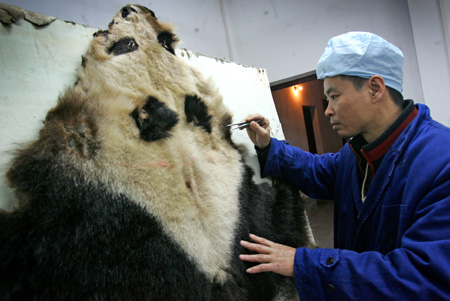 A staff member repairs a giant panda's fur at the Chongqing Science Museum in the southwest municipality of Chongqing November 30. Local police acquired the two pieces of giant panda fur during a raid to smash illegal exchanges of the fur. The price for one piece of giant panda fur on the black market is about US$ 10 million. [newsphoto]
