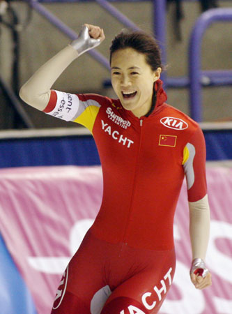 China's Wang Beixing celebrates winning the Ladies 500m race at World Cup Speed Skating in Calgary, Alberta, March 2, 2007. [Reuters]