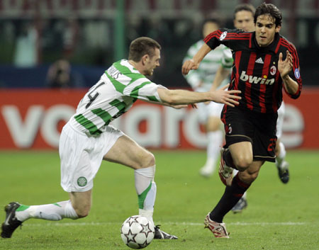 AC Milan's Kaka (R) fights for the ball with Celtic's Stephen McManus during their Champions League first knockout stage, second leg soccer match in Milan March 7, 2007. [Reuters]