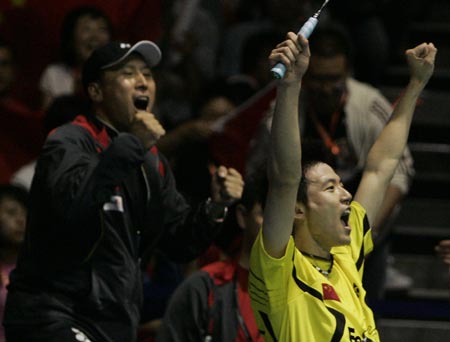 China's Cai Yun celebrates victory after he and partner Fu Haifeng won their doubles badminton match against Indonesia's Kido Markis and Candra Wijaya at the final of the Sudirman Cup World Team Badminton Championships in Glasgow, Scotland June 17, 2007. [Reuters]