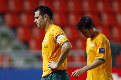 Australia's Mark Viduka (L) and Harry Kewell walk off the field after their AFC Asian Cup Group A match against Iraq at Rajamangala Stadium in Bangkok July 13, 2007. Iraq defeated Australia 3-1. [Reuters]