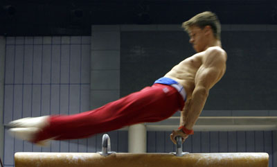 A gymnast takes part in a training session ahead of the FIG 2007 World Cup Gymnastics in Shanghai July 26, 2007. [Reuters]