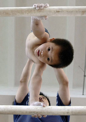 A gymnast from the Anhui provincial team practises with the help of his coach at a training center in Hefei, east China's Anhui province August 2, 2007. About 30 gymnasts, aged from 4 to 19, undergo training at the center, according to local media. [Reuters] |