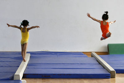 Girls practice on balance beams during a training session at the Gymnastics Hall of the Shanghai University of Sports August 7, 2007. Students of the gymnastics class of Yangpu District Youth Sports School are all aged 5 to 9. China's future Olympic hopefuls train at one of the thousands of provincial sports schools around the country. Even though these athletes might be too young to make the 2008 Beijing Games, they harbour dreams of winning Olympic gold in London 2012 or beyond. [Reuters] |