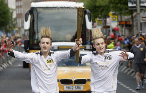 A young girl throws a wedding ball to the crowd below at Song City. The man who catches it will play her husband for the day in a mock wedding. Provided to China Daily |