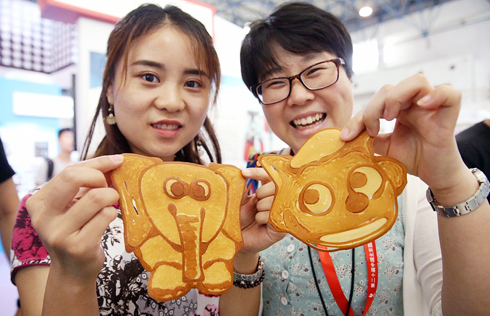 Two visitors hold up 3D printed pancakes of cartoon characters at the 20th China Beijing International High-tech Expo in Beijing on June 9.