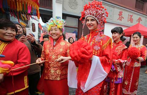 A foreign young lady in traditional Chinese wedding gowns, accompanied by an elderly Chinese lady, walks along a street in Nanjing, east China's Jiangsu Province on January 17, 2016. Together with two other beauties, the young lady who dressed in phoenix coronets and robes of rank is on her way to attend a traditional Chinese ceremony known as "Find Mr. Right by throwing a flower ball," which is part of an ongoing cultural festival called "Love in Nanjing".