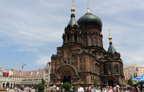 Visitors walks in front of the Saint Sophia Cathedral in Harbin, capital of Northeast China's Heilong province on July 24.