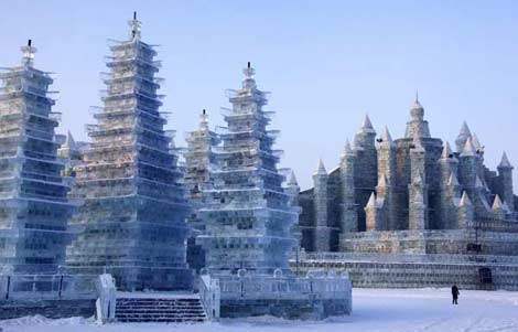 A workman walks near ice sculptures at the 12th Harbin Ice and Snow World display in the northern city of Harbin, Heilongjiang province January 4, 2011. The Harbin International Ice and Snow Festival will be officially launched on January 5.[Photo/Agencies]