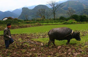 A newly-hired farmer plows a field with a water buffalo in Yangshi village, South China’s Guangxi Zhuang autonomous region, March 23, 2011. Extra labor was hired by local farmers on a part-time basis to assist with tending to fields this spring.