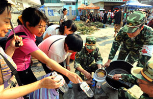People line up for medicinal soup in quake-stricken Yingjiang county, Southwest China’s Yunnan province, March 23, 2011.