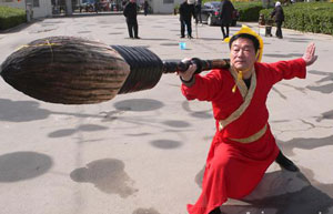 Bai Desheng, 60, performs martial arts as he practices calligraphy on the ground with a huge brush soaked in water, in Kaifeng city, Central China’s Henan province. Bai combines martial arts moves and handwriting as a new style of performance.
