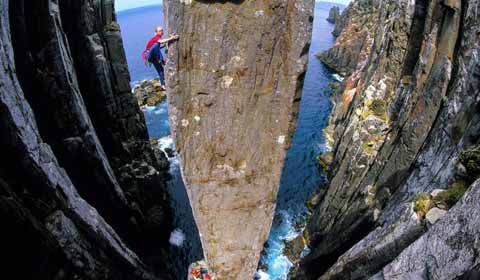 Climbers take on the Totem Pole, located at Cape Hauy in Tasmania, Australia - Towering 65 meters into the sky, the terrifying accent is a dream for climbers. The Totem Pole is a natural rock formation, known as a sea or coastal stack, located at Cape Hauy in Tasmania, Australia, where it attracts adventurers from across the world. A sea stack is a steep and often vertical column of rock, found in the sea or near the coast and formed by erosion. [Photo/icpress.cn]