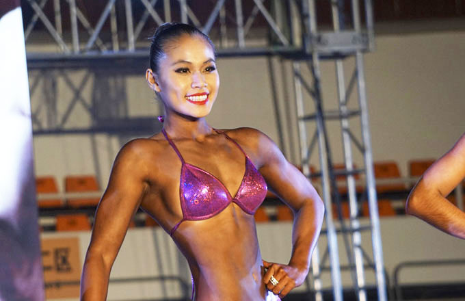 Student body builders flex their muscles on stage