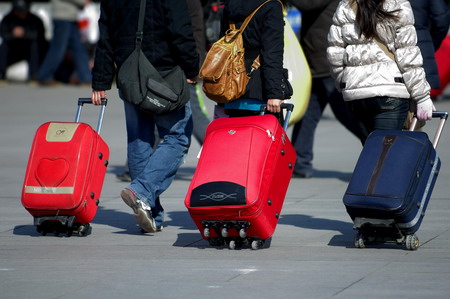 Travelers arrive at the railway station in Nanjing, east China's Jiangsu province to go back to their hometown, January 10, 2009. A total of 188 million people will be travelling by train in the country for family reunion during this year's Spring Festival travel peak, which will last 40 days until mid-February and strain the railway system. [CFP]