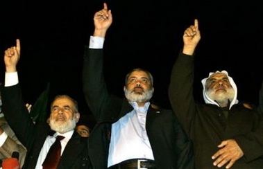Palestinian Prime Minister Ismail Haniyeh, center, celebrates with other