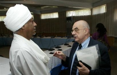 between meetings at the Darfur peace talks in Abuja, Nigeria Sunday, April