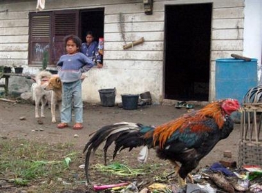 A youth stands with her dog outside her house as a chicken walks past by in Kubu Simbelang vilage where seven of a family of eight have been decimated by bird flu deaths, in North Sumatra, Indonesia, Thursday, May 25, 2006. The members of the family probably passed the disease among themselves, but health officials said there was no evidence the virus had mutated and decided against raising the pandemic alert level. [AP]