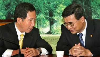 Keun-tae, left, talks with South Korean Unification Minister Lee Jong-seok