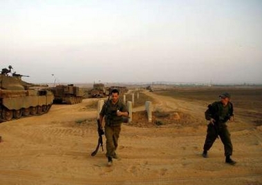 Israeli soldiers walk next to a convoy of Israeli tanks entering Gaza from Nizmit hill at the border of the Gaza Strip early July 3, 2006. A small Israeli force entered northern Gaza at daybreak Monday, but the military said it was a 'limited' mission to find explosives and tunnels near the border fence. [Reuters]