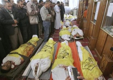 Mourners pray near bodies of the 18 Palestinians killed by
