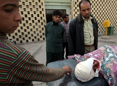 Iraqis look at a injured man at a hospital, following a mortar attack in Baghdad, Iraq, Monday, Nov. 20, 2006. A mortar shell slammed into an eastern Baghdad wholesale market area, killing three shoppers and wounding five others, police said. [AP]