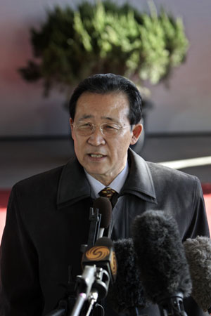 North Korean Vice Foreign Minister Kim Kye-gwan speaks to journalists after his arrival in Beijing ahead of the six-party talks December 16, 2006. North Korea said on Saturday it will not abandon its nuclear programmes until the United States gives up what Pyongyang regards as a "hostile" policy towards it and drops financial restrictions imposed last year. [Reuters]