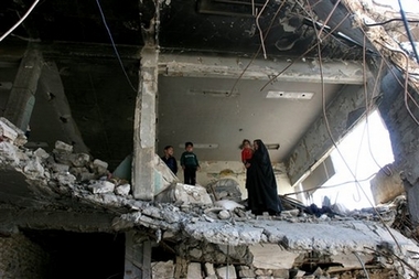 A woman carries her child through the ruins of Saddam