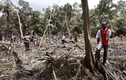 clean-up crew gathers at the scene of a Kenya Airways plane crash in a