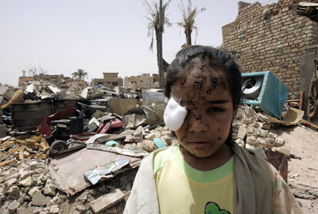 A girl wounded in a bomb attack stands near the rubble of her family's destroyed house in Baghdad June 3, 2007. Dozens of residents became homeless after Tuesday's bomb attack in a market in Baghdad's Amil district which killed 19 people and wounding 71 others. [Reuters]