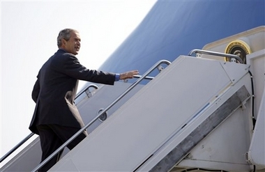 President Bush walks up the stairs as he boards Air Force One, Tuesday,