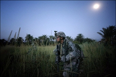 A US soldier from the Bronco Troop, 1st squadron, 14th Cavalry conducts a night patrol with three platoons in the village of Sweb, south of Baquba, 02 August 2007. US troop levels in Iraq have hit an all-time high with overlapping unit rotations pushing the total number up to nearly 162,000, the Pentagon said on Tuesday. [AFP]
