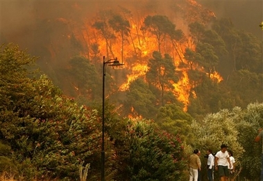 But the fires burning for three straight days obliterated vast swathes of the country and the death toll rose to 63. Desperate residents appealed through television stations for help from a firefighting service already stretched to the limit and many blamed authorities for leaving them defenseless. "Fires are burning in more than half the country," said fire department spokesman Nikos Diamandis. "This is definitely an unprecedented disaster for Greece." Diamandis said 89 new fires broke out during a 24-hour period starting at 6 am Sunday. Twenty-eight were considered particularly dangerous. Government and firefighting officials have suggested arson caused many of the blazes, and several people had been arrested. The government offered a reward of up to $1.36 million for anyone providing information that would lead to the arrest of an arsonist. Forest fires are common during Greece's hot, dry summers - but nothing has approached the scale of the last three days. Arson is often suspected, mostly to clear land for development. No construction is allowed in Greece in areas designated as forest land, and fires are sometimes set to circumvent the law. The front of one fire Sunday reached Ancient Olympia in southern Greece, burning trees and shrubs just a few yards from the museum at the site. Firefighters said the flames, fanned by high winds and swirling air, leaped hundreds of feet in the air at times. The nearby grounds of the International Olympic Academy were completely burned, as was the grove where the heart of Pierre de Coubertin, the founder of the modern Olympic Games, is buried. Although the pristine forest around Ancient Olympia was burned, none of the ruins were damaged. "Firefighters fought a battle in Ancient Olympia, which was won," Diamandis said. Authorities said at least two firefighters had been injured in the battle with the flames on Sunday. Ruined temples of Zeus, king of the ancient Greek gods, and his wife Hera stand on what was a lush riverside site - a flat stretch of land surrounded by pine-clad hills - near the stadium that hosted the ancient Olympic games for more than 1,000 years after they started in 776 B.C. The site strewn with fallen columns includes the remains of a gymnasium, a wrestling hall, hostels, bathhouses, priests' residences and altars. The 5th century B.C. limestone temple of Zeus is one of the largest in mainland Greece. Helicopters and aircraft covered the ruins with water and foam. The flames reached the edge of the ancient stadium, searing the grass and incinerating the trees on the hill above. Volunteers grabbed buckets of water and joined firefighters. "The important thing is that the museum is as it was and the archaeological site will not have any problem," Culture Minister George Voulgarakis said at the site. Firefighters remained in the area after dark to ensure the fire did not re-ignite. "It's hell everywhere," said Costas Ladas, a resident of Kolyri near Ancient Olympia, who said the fire covered more than a mile in three minutes. "I've never seen anything like it." Local schoolteacher Gerassimos Kaproulias criticized the government, saying it was totally unable to deal with the fires. "I am very angry," he said. "Nobody thought that one of the five most highly protected areas in Greece could be burned like this." The fire also blazed into the nearby village of Varvasaina, destroying several houses. As residents rushed to battle the flames, others, stunned, walked the streets holding their heads in their hands. The worst-affected region was around the town of Zaharo, south of Ancient Olympia. Thick smoke blocked out the summer sun and could be seen more than 60 miles away. The worst of the fires have been concentrated in the mountains of the Peloponnese in the south and on the island of Evia north of Athens. Strong winds blew smoke and ash over the capital, blackening the evening sky and turning the rising moon red. In the ravaged mountain villages in the Peloponnese, rescue crews found a grim scene that spoke of last-minute desperation as the fires closed in. Dozens of charred bodies have been found across fields, homes, along roads and in cars. The remains of a mother hugging her four children were found near the town of Zaharo in the western Peloponnese. Four people were killed in a new fire that broke out on Evia on Sunday, including two firefighters, the fire department said. Another two people were found in villages in the Peloponnese. New fires also broke out Sunday in the central region of Fthiotida - one of the few areas that had been unscathed, Diamandis said. Elsewhere, flames were about less than two miles from the Temple of Apollo Epikourios, a 2,500-year-old monument near the town of Andritsaina in the southwestern Peloponnese, said the town's mayor, Tryphon Athanassopoulos. "We are trying to save the Temple of Apollo, as well as Andritsaina itself," he told Greek television. Across the country, churchgoers prayed for the blazes to abate. Nearly 4,000 soldiers, backed by military helicopters, were sent to reinforce firefighters over the past three days, and at least 12 countries were sending aid. |