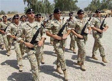 Polish soldiers march in their camp in Diwaniya, 180 km (112 miles) south of Baghdad, July 25, 2007. [Reuters]