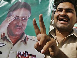 A supporter of Pakistan's President Pervez Musharraf makes a victory sign in front of the Parliament building during the presidential election in Islamabad October 6, 2007. [Reuters]