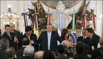 The public ceremony, gathering presidents representing Argentina, Venezuela, Brazil, Bolivia, Ecuador, Uruguay and Paraguay formally creates the bank, which starts work with US$7 billion in capital. Its head office will be in Venezuelan capital Caracas, with two branches: in Argentina capital Buenos Aires and Bolivia's legislative capital La Paz. The presidents have previously said that the Bank aims to stimulate economic growth with cheap credit for infrastructure projects and financing for private sector projects. |