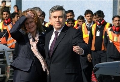 Britain's Prime Minister Gordon Brown (R) and his wife Sarah pose for photograhs following their arrival at the Air Force station in New Delhi, on January 20 2008. [Agencies]
