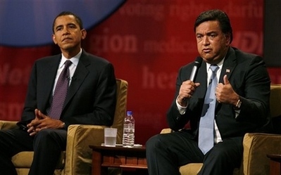Democratic presidential hopeful, New Mexico Gov. Bill Richardson, right, speaks during the Brown & Black Forum as fellow hopeful, Sen. Barack Obama, D-Ill., looks on, Saturday, Dec. 1, 2007, in Des Moines, Iowa. [Agencies]