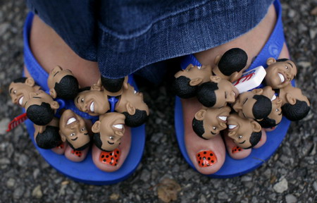 A guest wears footwear decorated with a Barack Obama theme at Belmont University before the presidential debate in Nashville, Tennessee October 7, 2008. [Agencies]