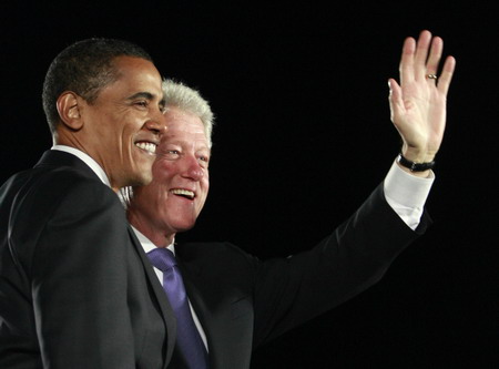 US Democratic Presidential nominee Senator Barack Obama (D-IL) is pictured with former President Bill Clinton (R) during a campaign rally in Kissimme, Florida, October 29, 2008. [Agencies]