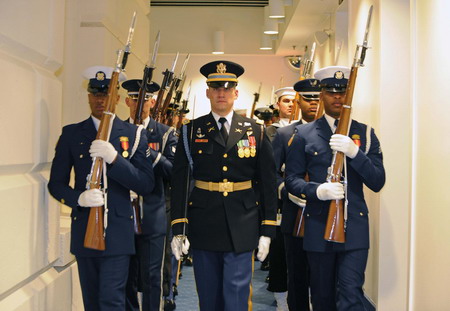 Members of the joint honor cordon carry weapons at port arms as they get ready at the US Capitol for the 56th Presidential Inauguration to begin in Washington, January 20, 2009. More than 5,000 men and women in uniform are providing military ceremonial support to the presidential inauguration, a tradition dating back to George Washington's 1789 inauguration. [Agencies]
