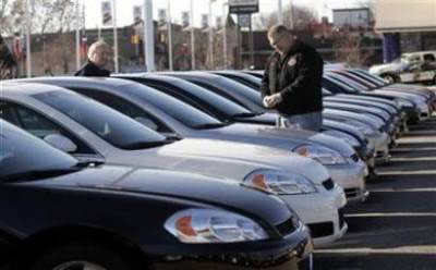 Car salesman Ray Schaffer (L) shows a customer a 2009 Chevrolet Impala sedan at a dealership in Dearborn, Michigan December 29, 2008. [Agencies]