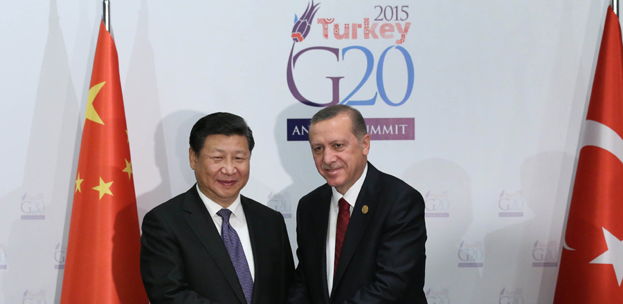 Chinese President Xi Jinping (L) meets with his Turkish counterpart Recep Tayyip Erdogan in Antalya, Turkey, Nov 14, 2015.