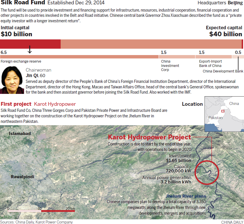 Silk Road Fund Co, the management arm of the fund, has signed a memorandum of understanding with China Three Gorges Corp and the Pakistan Private Power and Infrastructure Board to provide capital to build the Karot Hydropower Project on the Jhelum River in northeast Pakistan.